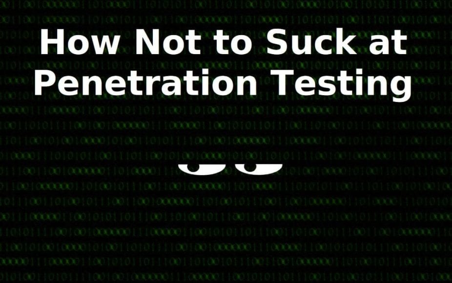The name of this presentation is “How not to suck at pen testing”. There’s a lot of presentations that you’ll see where people just rip on the pen testing industry, and trust me, we are going to have a couple of slides of that. But what I want to try and establish is some type of mental framework whenever you go in to a pen test, to establish what it is you are going to do, how you are going to do it and, more importantly, why we are doing what we are doing.